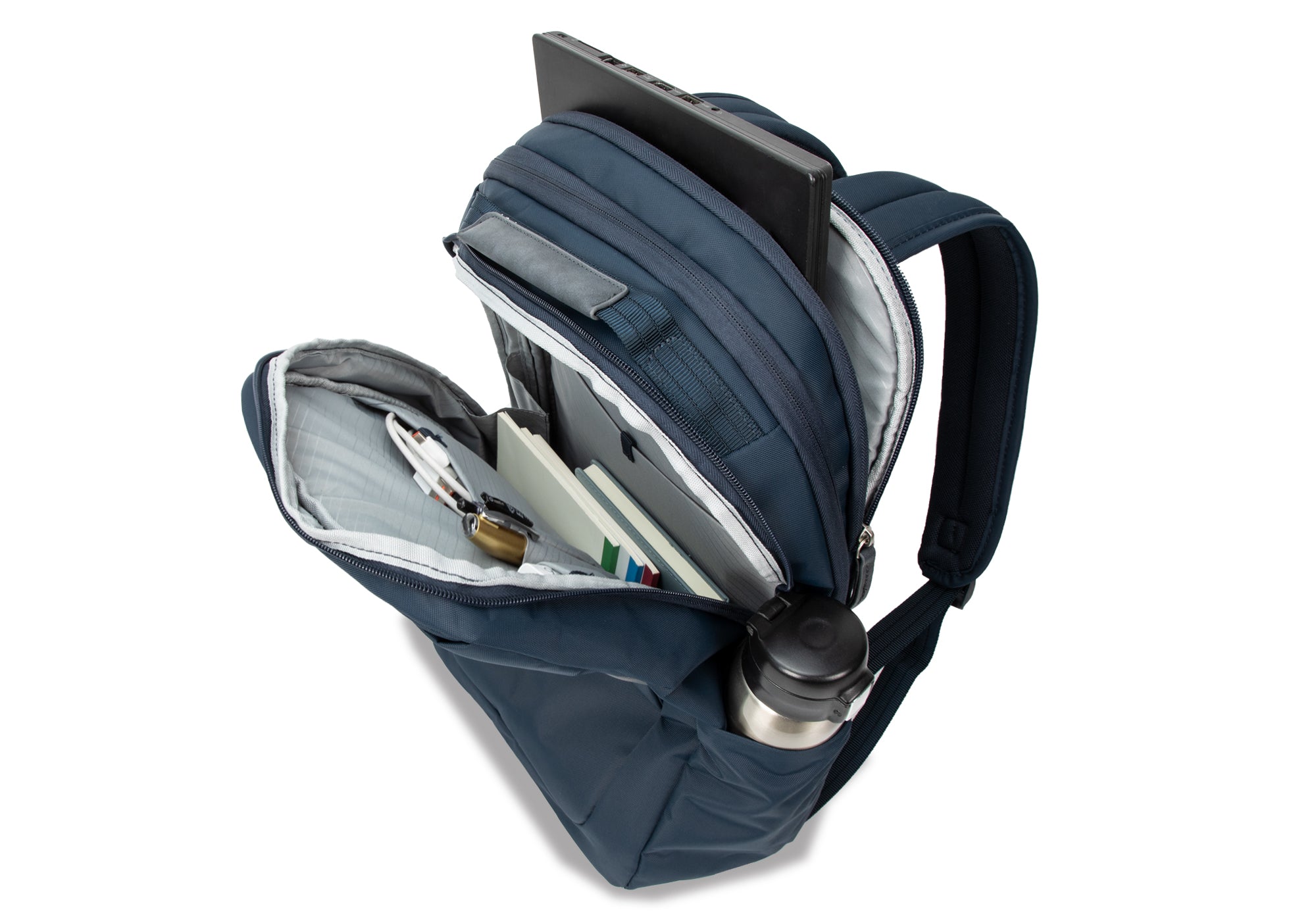 - The front pocket features organized compartments for storing tablets, phones, pens, and small items.